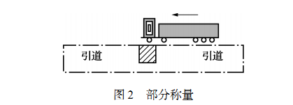整車稱量是承載器支撐一輛車輛的整體進行稱量得到車輛總質(zhì)量的稱量方式,如圖1所示,前后兩側(cè)為引道,斜線框為動態(tài)地磅的承載器,能夠同時支撐車輛的整體。部分稱量是在同一承載器上對一整輛車進行兩次或兩次以上的稱量,稱量后可將每部分(如軸載荷)稱量結(jié)果相加,得到車輛總質(zhì)量的稱量方式,如圖2所示,承載器只能同時支撐車輛的一個軸。