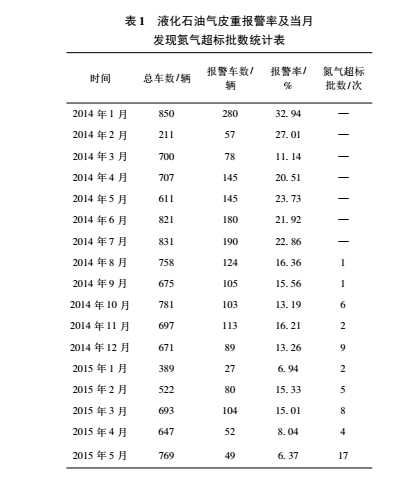 1.發(fā)現(xiàn)氮?dú)獬瑯?biāo)。煉油部與計(jì)量中心于2014 年 7 月出臺(tái)聯(lián)動(dòng)流程后,出廠(chǎng)的液化石油氣車(chē)況改善很大,表 1 是煉油部出廠(chǎng)的液化石油氣在 2014 年 ~ 2015 年 5 月,每月的車(chē)輛皮重報(bào)警率統(tǒng)計(jì)和推出聯(lián)動(dòng)流程后當(dāng)月發(fā)現(xiàn)氮?dú)獬瑯?biāo)的批數(shù)統(tǒng)計(jì)。在這段時(shí)間裝運(yùn)液化石油氣的車(chē)輛共有 230余部,多為散戶(hù)。管控力度大時(shí),如 2015 年 5 月,標(biāo)準(zhǔn)皮重的維護(hù)權(quán)限由車(chē)間專(zhuān)人接管,共查到 17批氮?dú)獬瑯?biāo)車(chē)輛,當(dāng)月的皮重報(bào)警率最 低,為 6. 37% 。