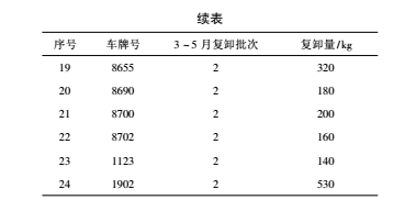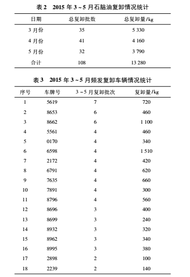 2.主輔比對(duì)數(shù)據(jù),復(fù)卸次數(shù)減少,虧損率下降。石腦油是天津石化采購(gòu)的大宗物料,物資裝備部委托某大型運(yùn)輸公司承運(yùn)。我們的卸凈控制指標(biāo)是,當(dāng)供方磅單凈重大于我方凈重 90 kg時(shí),要求司機(jī)回卸車(chē)棧臺(tái)復(fù)卸。因棧臺(tái)的卸料泵功率較低,并且較陳舊,卸料速度較慢,且因棧臺(tái)人員顧慮泵空轉(zhuǎn),損傷泵體,造成卸料不凈,這是客觀(guān)原因。還有主觀(guān)原因,部分車(chē)輛幾次三番發(fā)生復(fù)卸現(xiàn)象,并能卸出超過(guò) 60 kg 的油料,有故意不卸凈傾向。這些情況承運(yùn)公司并不知曉。我們通過(guò)統(tǒng)計(jì)比對(duì)數(shù)據(jù),統(tǒng)計(jì)頻發(fā)復(fù)卸車(chē)輛的情況 ( 見(jiàn)表 2 和表 3) ,通報(bào)并敦促運(yùn)輸公司管理層,加強(qiáng)對(duì)承運(yùn)司機(jī)的管理和考核,使司機(jī)自覺(jué)卸凈。