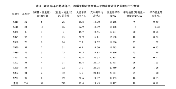 表 4 中的 12 輛車(chē)是當(dāng)月進(jìn)煉油部裝載丙烯的全部車(chē)輛,從數(shù)據(jù)分析可以看出,X118 車(chē)輛非??梢?  差量 = 衡量 - 流量計(jì)為負(fù)差的車(chē)數(shù)比率最高,為 52. 9% ,平均差量比率最小,為 - 0. 32‰。