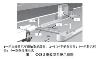 根據(jù)目前高速公路收費(fèi)口所安裝的公路計(jì)重收費(fèi)裝置一動態(tài)軸重地磅(圖1),其實(shí)際承載面 積較小,寬度只能適應(yīng)車輛每個(gè)單軸依次通過。
