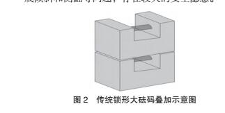 目前廣泛應(yīng)用的動態(tài)軸重地磅的承載臺尺寸般為長(3.2 m) X寬(0.8 m),超寬車道為長(4.0 m) X寬(0.8 m),承載臺面積約為2.56 m2和3.2 m2。 而在靜態(tài)加載稱量試驗(yàn)時(shí),通常采用傳統(tǒng)1 t的鎖形大砝碼,其尺寸約為:長(0.8 m)x寬(0.6 m)x 高(0.52 m),底面積為0.48 m2 (圖2)。在砝碼進(jìn)行 加、卸載過程中,往往會受限于砝碼自身高度和底 面積的因素,較難控制加載的高度和實(shí)現(xiàn)最大量程 的加載,且當(dāng)砝碼疊加過程中若重心不穩(wěn),極易造 成傾斜和側(cè)翻等問題,存在較大的安全隱患。