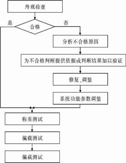 地磅經(jīng)過(guò)一段時(shí)間的使用,出現(xiàn)偏差是正常的。引發(fā)汽車衡偏載超差的原因有多種,有時(shí)甚至幾個(gè)原因同時(shí)出現(xiàn)。在現(xiàn)場(chǎng)調(diào)試時(shí),一般應(yīng)遵循以下步驟,采用多種方法分析超差原因,利用角差公式詳細(xì)排查調(diào)試環(huán)節(jié),偏差即可解決,附調(diào)試步驟圖(見圖3)。
