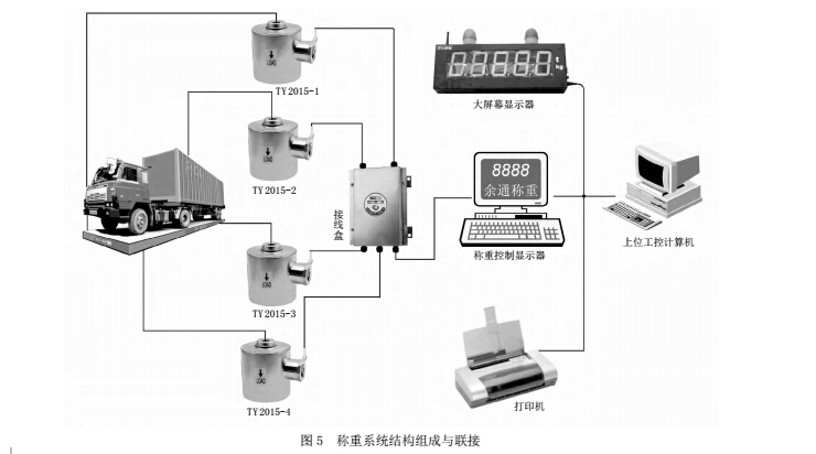 (二) 稱(chēng)重系統(tǒng)主要功能:汽車(chē)衡稱(chēng)重系統(tǒng)主體結(jié)構(gòu)與聯(lián)接如圖 5 所示。由承重秤體、稱(chēng)重傳感器(4 組)、稱(chēng)重信號(hào)接線(xiàn)盒、稱(chēng)重顯示控制器、大屏顯示器、打印機(jī)等組成,稱(chēng)重?cái)?shù)字信號(hào)可上傳到上位工控計(jì)算機(jī)。